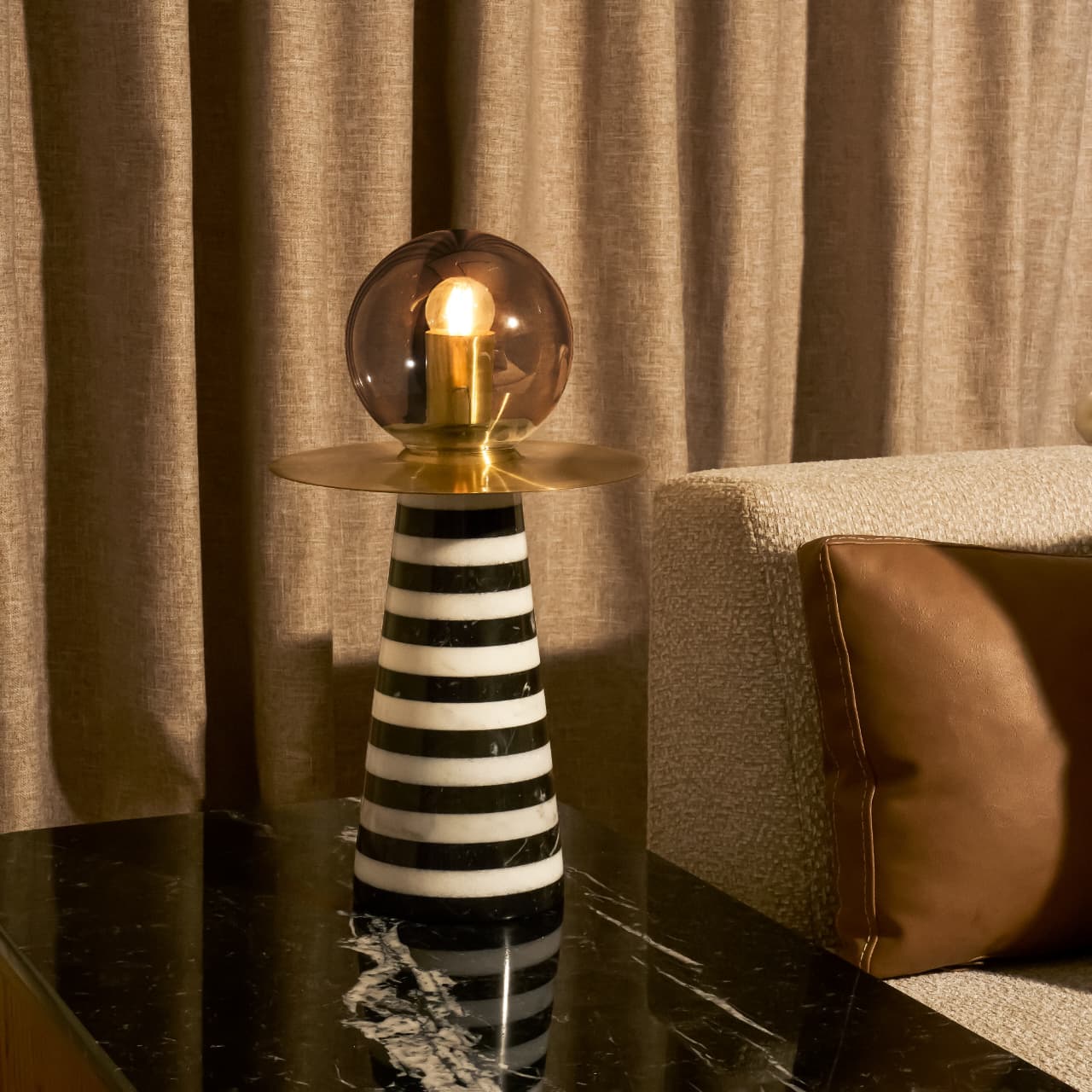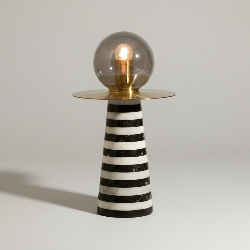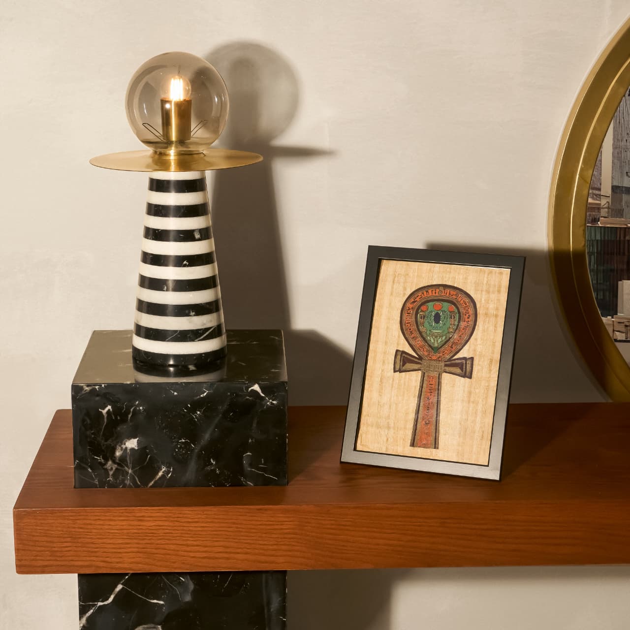 The “Ankhette” lamp derives its name from the ancient Egyptian symbol of life, the Ankh, symbolizing eternal life and regeneration. Crafted with a luxurious striped black and white marble base, each lamp is a unique piece, handcrafted to perfection. The genuine brass disc atop the base signifies eternity and the divine, adding a touch of opulence and elegance to its design. The round light bulb, reminiscent of the sun, illuminates the brass disc, creating a mesmerizing effect that transforms any space into a sanctuary of light and heritage. The Ankhette Lamp is not just a source of illumination but a symbol of timeless beauty and cultural significance, inviting you to bask in its warm glow and embrace the rich heritage of ancient Egypt.
